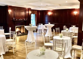 Adorned with brass bar tables and plenty of seating centered around the mansion’s original library fireplace, this room is the ideal setting for corporate events and small, intimate cocktail receptions.