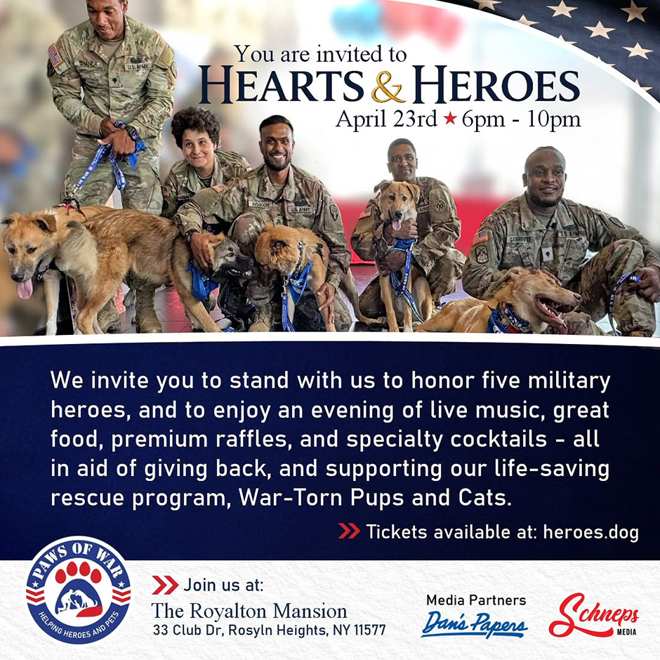 Join us for an unforgettable evening celebrating courage, compassion, and the unbreakable bond between our nation’s heroes and the animals who stand beside them. Hearts and Heroes honors the lifesaving work of Paws of War, whose mission is to support veterans, first responders, and their families through service dogs, emotional support animals, and life-changing programs that restore hope, healing, and independence.
